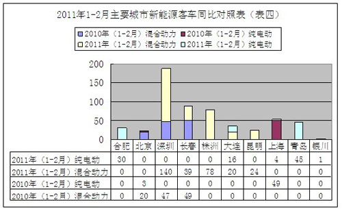 2011年1-2月份,全国共有10个城市有新能源客车进行了注册登记,这10个城市与上年同比,增长幅度较大的依次是深圳93辆,株洲78辆,青岛45辆和合肥30辆。其中深圳、株洲和昆明采用的是混合动力客车,青岛和合肥采用是纯电动客车。