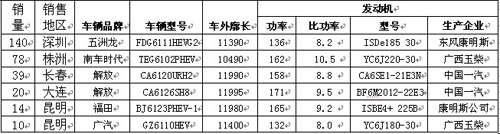 从销售出的301辆混合动力客车产品结构来看,车长主要在10.5米、11.4米及12米三种长度,各长度段分别占26%、50%和24%,由此可见,11.4米是“十城千辆” 混合动力市场需要的主流车型。从所配柴油发动机动力大小分析,10米及12米车柴油动力比功率比11米车高,从发动机厂家技术来源来看,以康明斯系为主,占了51%的市场份额。