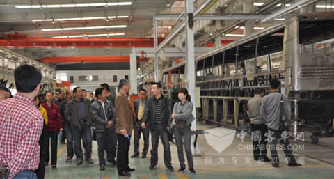 在上午会议中,与会领导一同考察江淮客车新基地及产品。江淮客车2009年在合肥市包河区工业园举行了新基地建设项目奠基仪式,新征土地26.7万平方米,现已进入搬迁收尾阶段。全新的厂荣厂貌,先进的生产设备、完善的完检车间、U型的试车跑道等等,新基地现已具备年产12000辆的客车生产能力,年产值将可达到25亿元。产品是企业的核心生命力,江淮客车以现代技术进行自主开拓,利用国内各种设计资源,加大联合开发的力度,力求为用户提供可靠的节油精品,不断开发适销对路的新产品