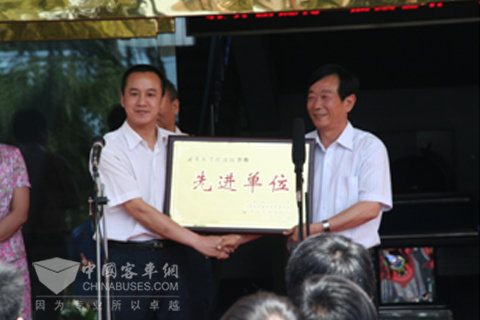 王书记简单介绍了与会领导及仪式议程,并宣读了河南省总工会《关于表彰河南省“五一”劳动奖状的决定》;接着,在喜悦、明快的音乐声中,王海林主席向少林汽车颁发了河南省“五一”劳动奖状和河南省节能减排竞赛先进单位奖牌,韩和平副书记和王晓瑞主席分别接受奖状、奖牌,台下掌声阵阵;随后,周文昌书记代表公司发言,他说,今年五月,郑州市“五一劳动奖状”、河南省“五一劳动奖状”、河南省节能减排竞赛先进单位、河南省节能减排竞赛先进班组四大殊荣的连获,是省、市各级总工会对全体少林汽车人工作的肯定,更是对少林汽车事业发展的褒奖。这不仅仅是一份荣誉,更是一份责任。未来任重而道远,这份荣誉更加坚定了少林汽车发展的信心。今后,少林汽车公司将以此为契机,珍惜荣誉,秉承“从无路处开路无处无路”的企业精神,乘胜前进,圆满完成“十二五”规划各项目标任务,为区域经济的发展、为国家汽车产业的崛起做出更大的贡献!