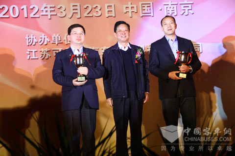中国旅游车船协会会长杨和平(中)为北方客车副总经理高斌(左一)颁奖