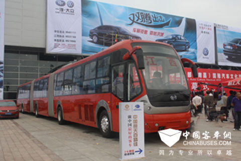 中国恒天•百路佳客车精彩亮相。27米双铰“世界上最长”的大客车(BRT)展示于主席台旁,引来众多关注的目光,各路媒体争相报道。