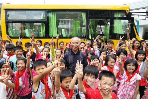 虽是周日,可环球小学的学生们都早早的来到学校等待着。上午十点,一辆崭新的“长鼻子”校车驶进校园。孩子们欢呼雀跃,车还没停稳就急着想坐上自己的校车。校车在长途跋涉后难免有灰尘,于是有的孩子一遍遍地用手擦拭校车上的玻璃,想让新校车不染一丝尘埃……