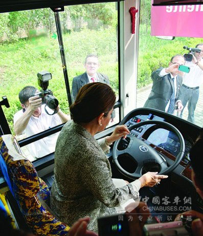 哥斯达黎加总统钦奇利亚登上海格天然气客车参观并体验驾驶区
