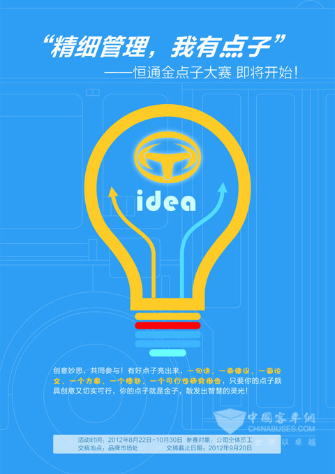 另外,恒通客车将成立公司领导评审团,以公平公正的原则对点子进行初评,从中评选出10个优秀的点子。