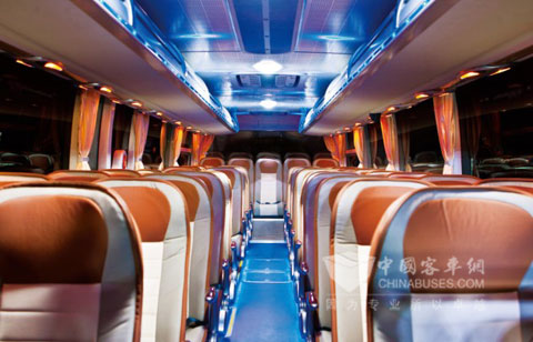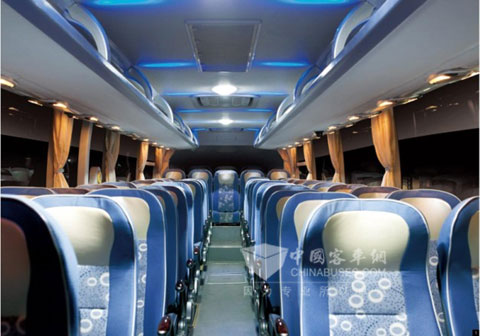 10米系列客车均采用绿色环保的复合阻燃材料,提升了车辆的被动安全性能。同时,空调增加了换新风功能,在压缩机不启动的情况下,可以启动空调换新风功能,轻松实现车内换气,既节能又能保持了车内空气的清新自然。另外,该车创新应用了隔声材料和吸声材料,怠速噪声为61.9分贝,远低于行业65分贝的水平;平顺性指数为114.1分贝,比行业水平118分贝低将近4分贝,乘客的乘车舒适度将大大提高。