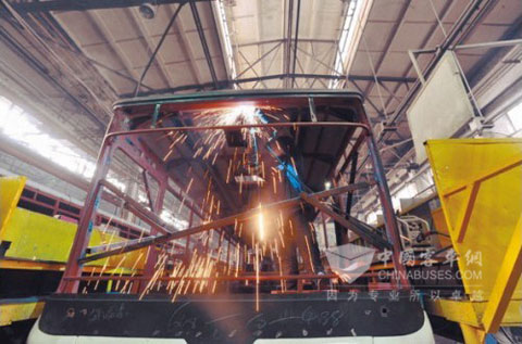 10月20日13时,记者首先走进了丹东黄海的焊接车间,看到巨大的厂房内,随处可见组装公交车的各种零部件,顶棚、前脸、后架等。将零部件在指定区域内的模架上支撑好,然后每台车均由三四名工人焊接固定,火花四溅中一台长11.5米、宽2.5米的公交车车体就已初见雏形。