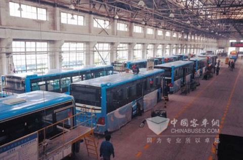 厂区内 30台公交同时组装