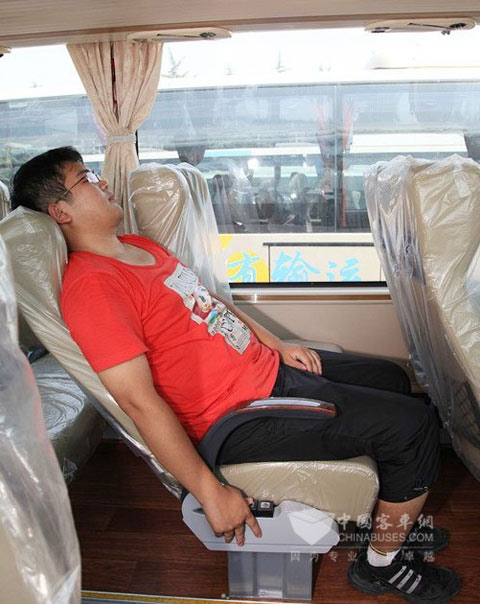 虽然采用了“一层半”的结构,但该车型的内高仍达到了198 cm,内宽则为232 cm,过道宽57 cm,过道与乘客区地板的台阶高度差为9 cm,行李架深32 cm。乘客座椅靠背高75 cm,坐垫宽、深分别为45和48 cm,相邻座椅可横向拉伸出6.5 cm,座椅排间距为76 cm,膝部间距28 cm,座椅靠背上沿据空调灯光控制面板46 cm,坐垫上沿距地板45 cm。