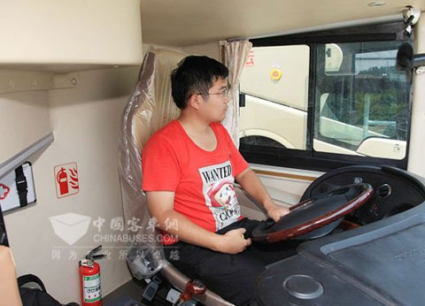 经过体验,记者发现除了对乘客区的细致入微,设计者还在驾驶区上倾注了很大精力。该车型为“一层半”结构,所以驾驶区采取了下沉式设计,尽管为了保证第1排乘客的纵向空间,驾驶区空间必须尽可能压缩,但记者在驾驶员座椅上的正常坐姿情况下仍拥有近一拳半的头部空间。驾驶区配备了独立空调、风扇、冷暖除霜器等;驾驶员座椅为6向调节;驾驶员拥有开阔的视野,宽适操作区域,腿部活动范围加大,欧洲造型仪表盘标志清晰,设计者根据按钮使用频次和重要程度对其进行人性化布局。驾驶区还经过人机工程学分析,对挡把、踏板位置等进行了精心设计。此外,该车型配备的“安节通”系统为标准配置,用户还可选装绿区安节助驾系统。