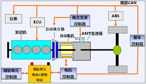混合动力客车是将内燃机、驱动电动机与动力储能装单元结合,通过控制系统,驱动电动机可补充提供车辆爬坡、加速时所需动力,又可以吸收并存储内燃机富余能量和车辆制动能量,从而降低车辆油耗或气耗,同时减少污染物排放。