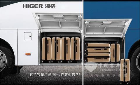 大开度大空间超大行李舱是海格客车赋予E系新中巴的一大亮点。随着国家政策对等级最大座位数的限制,海格把设计思路更多转向了车内空间的优化与合理利用,在乘坐空间和行包收益上做更多考量。E系新中巴不仅车内净高达1930 mm,而且行李舱舱门达到789 mm,舱容积达到4.2立方米(行业平均水平为3.5立方米),比市场同类车型平均大20%。以9米中巴兼顾小件快递所经营的收益结果显示:按装满后单趟快递收益为200元,每天两个来回,每年运营300天计算,那么将增加收益为:(200元 /3.5立方米)×(4.2-3.5)立方米×4次×300天=48000元,经营8年下来,比市场同类车型将额外增加收益38.4万元。