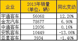 安凯客车和亚星客车2013年销量均出现下滑。安凯客车2013年销售客车10449辆,同比下滑13.06%;亚星客车2013年销售客车3934辆,同比下滑1.4%。