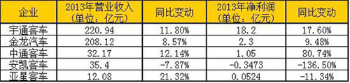 客车上市企业2013年营收盘点--中通净利润大增80.74%,安凯亏损