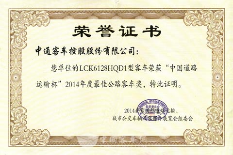 LCK6128HQD1“中国道路运输杯”2014年度最佳公路客车奖