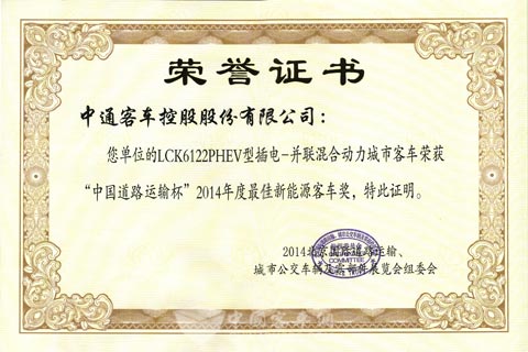 LCK6122PHEV“中国道路运输杯”2014年度最佳新能源客车奖