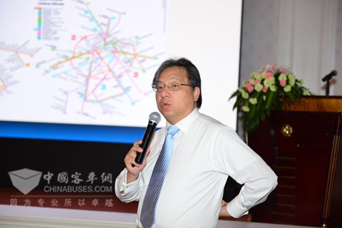 针对城市化发展中遇到的"拥堵"问题,长安大学特聘教授、交通部科学研究院客座教授、快速公交专家、北京市政府交通顾问徐康明教授分享了北京、杭州、常州等地的快速公交经验。"快速公交是创建低能耗、低污染、低土地占用、低政府财政负担,低市民出行费用负担、高效率、高服务品质的公关交通体系。北京、济南、郑州、合肥等21个城市及国外220座城市的BRT运营均说明该模式的优越性,其对道路资源的占用仅为小汽车的1/20。应用车型方面,福田欧辉客车13.7米、16米、18米大容量公交车型非常适合快速公交班线。"徐康明说。
