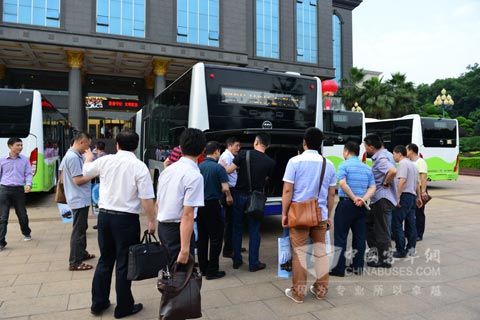在分享了各自的经验后,与会嘉宾参观了福田欧辉18米LNG公交车及最新研发的插电式混合动力城市客车,据悉,插电式混合动力城市客车已经在长沙批量投入运营,示范效果良好,预计2014年将会有更多市民享受到"绿色出行"的福利。