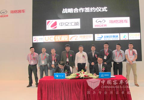 在2014北京道路运输展上,最吸引人眼球的莫过于海格云战略的发布。众多互联网企业"大腕"作为合作方出席,使得一个纯粹的行业性展会顿时"高大上"起来。而在苏州金龙总经理吴文文与中交汇能总经理阎琳签署战略合作协议时,这些企业的代表均站在后面,以示支持。