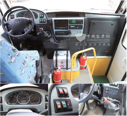 由于试驾车型面向全国大众推广,且为订单式生产,标配车型并未匹配空调,而是安装了一台电风扇,此项配置的变化可以降低1万多元的成本,而且避免了使用空调造成的动力不足情况。此外,手动折叠车门与简单朴素的仪表台设计,同样都是控制成本与追求实用的体现。但长安校车并非一味追求降低成本而忽视车辆的安全与可靠性,在关系到上述2方面时,丝毫没有降低标准。该车符合专用校车标准的应急设备一应俱全,全车共有5个摄影头,便于驾驶员观察车内车外情况,“安行”(Ansing)智能运营管理系统,集成了驾驶行为管理、行驶路线导航规划、车辆监控、乘员管理等项功能。