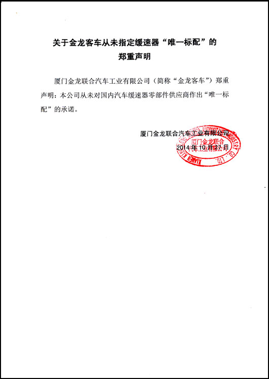 关于金龙客车从未指定缓速器“唯一标配”的郑重声明