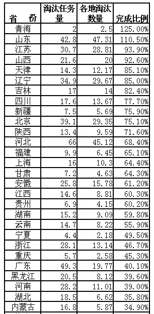这位负责人表示,总的看,这项工作进展还不平衡。目前全国仍有三分之一淘汰任务未完成。青海、山东已提前完成全部淘汰任务,江苏、山西、天津、辽宁、吉林、四川、新疆、北京等8个省(市、区)已完成任务总量的75%以上;广东、重庆、浙江、宁夏、云南、湖南等6省(区)完成任务不足60%;广西、西藏、海南、内蒙古、湖北、河南、黑龙江等7省(区)严重滞后,完成任务不足40%。