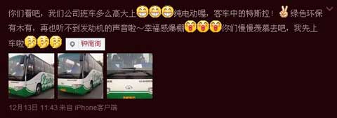 那么,当班车再贴上一张绿色标签,高大上的感觉有没有?近日,某企业工作的冷先生分享了这样一条微博:单位班车高大上,纯电动喔,班车中的特斯拉,幸福感爆棚……”