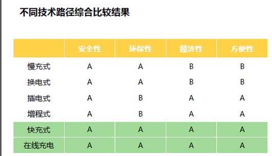 经过课题组从安全性、环保性、经济性、方便性四个方面的综合比较后,其结论是:纯电动慢充、换电式客车是2A,插电式、增程式3A,纯电动快充式、在线充电式客车是4A。