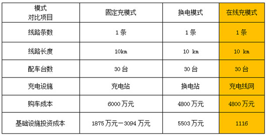 (按1条线路在线充模式与其他模式对比表(30台车标准计算)