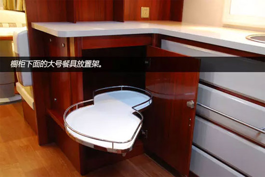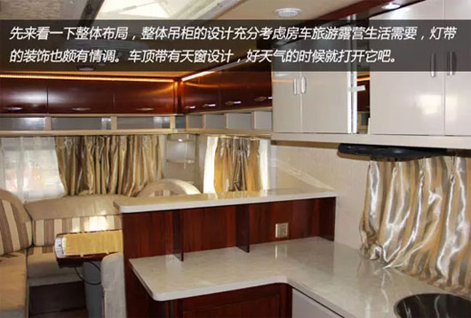 车辆家居内设豪华双人床、环形沙发、整体吊柜、整体橱柜、整体卫生间、豪华淋浴装置、冷暖空调等设施,充分考虑房车旅游露营生活需要,满足房车露营便捷、娱乐的需求。车内皮革面料、环保板材内饰、进口高档环保防滑磨地板革,体现了中通房车绿色宜家的设计理。
