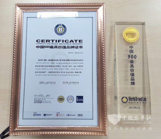 2015年6月16日,“世界品牌大会”在京发布2015年(第十二届)《中国500最具价值品牌》排行榜。在这份基于财务、消费者行为和品牌强度分析而获得的中国品牌国家队阵容中,海格客车品牌已连续第八年上榜。从2008年初登“中国500最具价值品牌”榜开始,海格品牌价值逐年提升,品牌价值从当年的60亿元提升到如今的202.86亿元,年度排名由去年的134位提升为129位。