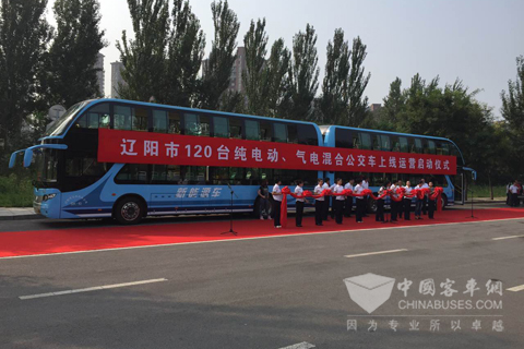 2015年8月17日上午,辽宁省辽阳市在河东新城举行120台宇通节能与新能源公交车上线运营启动仪式,吸引众多市民关注。辽阳市人大、市政府、市政协等班子有关领导,以及辽宁省运管局、辽阳市交通局、市运管处和辽阳市公共汽车公司的相关领导出席活动现场。包含90台新能源公交和30台天然气公交的120台宇通客车即日起投入辽阳市,而其中的90台新能源公交在仪式上格外引人注目。