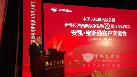 为进一步揭秘受阅客车的受阅历程和幕后故事,全方位展示安凯宝斯通客车的至臻品质,2015年9月9日,中国人民抗日战争暨世界反法西斯战争胜利70周年受阅客车安凯·宝斯通客户交流会在北京钓鱼台国宾馆盛大举办!会议现场,江淮汽车董事长安进、安凯客车董事长戴茂方等公司高层领导出席作重要讲话,并与参阅的军方领导、来自全国各省市的重点客户代表、以及中央电视台等核心媒体等各界精英近三百人一道,共同见证了安凯宝斯通的荣耀与喜悦!
