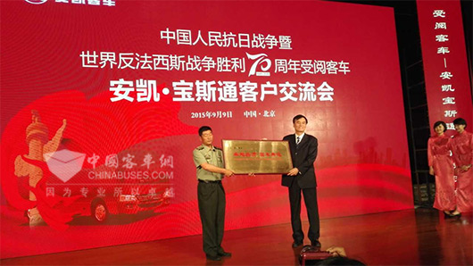2015年9月3日,纪念中国人民抗日战争暨世界反法西斯战争胜利70周年阅兵活动在北京天安门隆重举行,中国人民也迎来了我国历史上的第一次胜利日大阅兵!阅兵式现场,作为唯一一个直接参与阅兵式的客车品牌,经过特别改装的敞篷版安凯宝斯通客车搭载着抗战老兵方队与我国高精尖军事装备同台受阅,成功造就了中国自主品牌汽车发展史上的永恒骄傲!