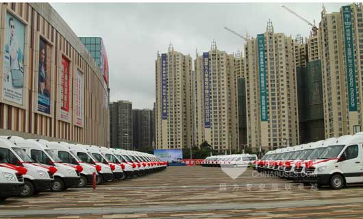 2015年9月12日下午,106辆海格H6V纯电动客车整齐地排列在贵阳市观山湖区红华新天地广场内,白色的车身,绿色的“龙行神州”字样和图案,靓丽无比,引得数百名市民前来参观。参观市民纷纷表示,这么威武的车阵,这么多纯电动客车,这在贵州省还是第一次看到。