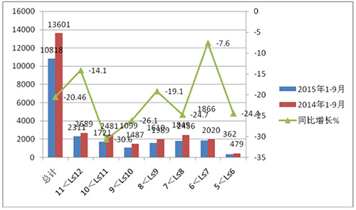 1、2015年1-9月,11-12米CNG客车销量最大,其次是6-7米,再次是7-8米,最小的是5-6米。