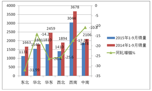从上图表可知,西南区域CNG客车销量最大,其次是华东区域,再次是中南区域,降幅幅最大的是东北区域市场,其次是华东区域,再次是西北区域。