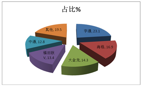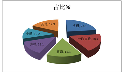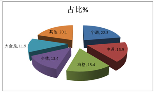 4、西北区域。2015年1~9月陕西、甘肃、宁夏、新疆等西北区域共有18家客车品牌参与了CNG客车销售,新疆自治区销售最多,从车型看,大、中、型客车比例大致为3:2:1;宇通客车居首位,占据大约22%的市场份额,销售的主要其他各主流品牌市场份额如下图: