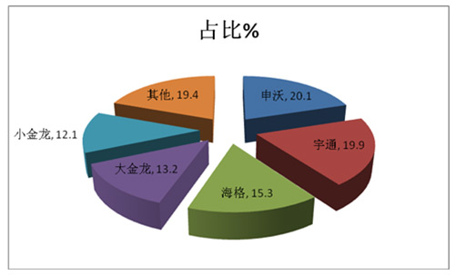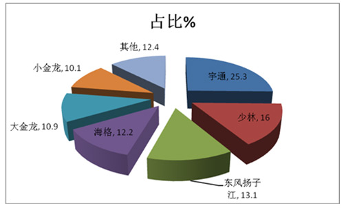 在中南市场,宇通客车占据25.3%的市场份额,其次是少林客车占据16.0%,再次是当地东风扬子江客车占13.1%,第四是海格客车占据12.2%,第五是大金龙客车占据10.9%,第六是小金龙占据10.1%,其余品牌占据了12.4%的市场份额,可见中南区域属地的客车企业也占了一定的优势地位,但仍然不敌客车盟主宇通。