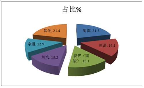 在大西南市场,当地企业蜀都客车占据21.3%的市场份额,其次是位于重庆的恒通客车,占据16.1%的市场份额,再次是四川现代客车占15.1%,第四是当地川汽客车占据13.2%,第五是宇通客车占据12.9%,其余品牌占据了21.4%的市场份额,可见西南区域属地的客车企业在西南市场占了绝对的优势地位。