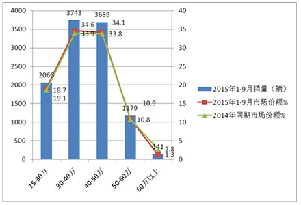 1、2015年1-9月,40-50万和30-40万两价格区间,是CNG客车销量最大的两个主力区段,几乎各占据超过总体销量的三分之一,且同比有上升迹象,其余区间销量较少,销量分布出现了"两头小,中间大"的市场迹象。