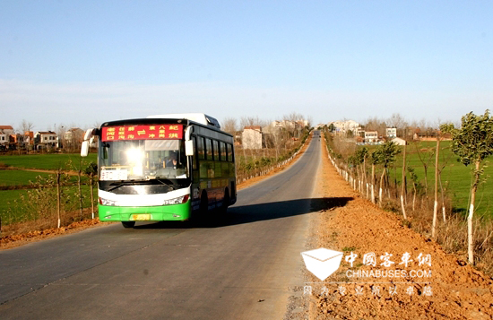 图为乡村道路上奔跑的客车