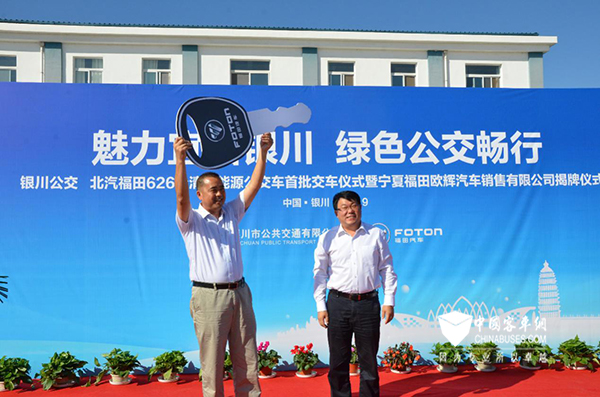福田汽车集团副总裁,欧辉客车党委书记、总经理范现军向银川市交通运输局副局长、银川公交公司总经理柯念国交付钥匙