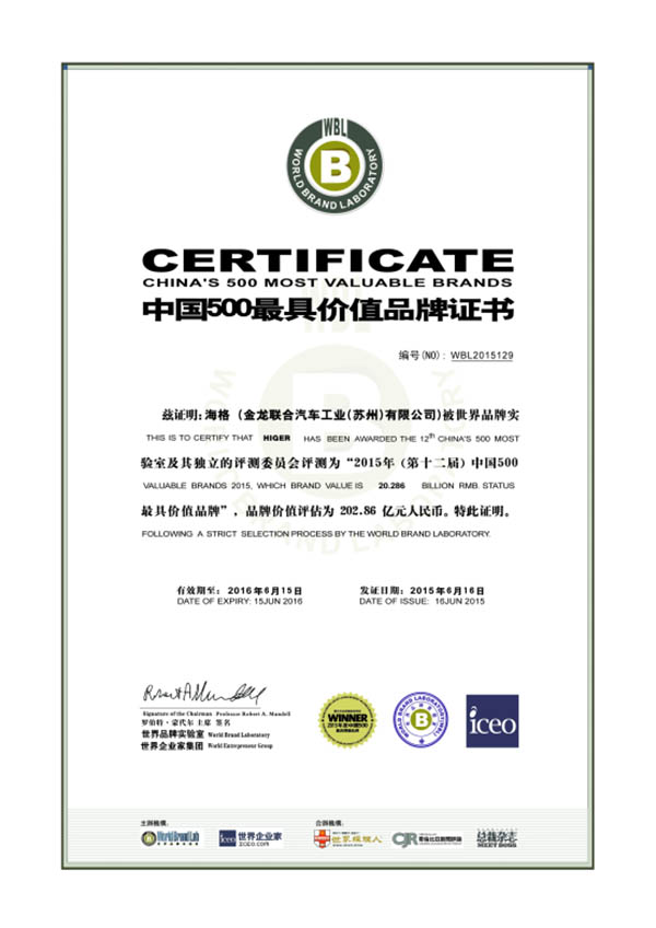 2015年,苏州金龙销售额再次突破百亿元,稳居百亿级企业行列,大中客产销量连续多年居行业第二位。与此同时,苏州金龙还致力于打造民族客车品牌,2015年品牌价值突破200亿元,“海格HIGER”商标被国家工商总局认定为“驰名商标”。