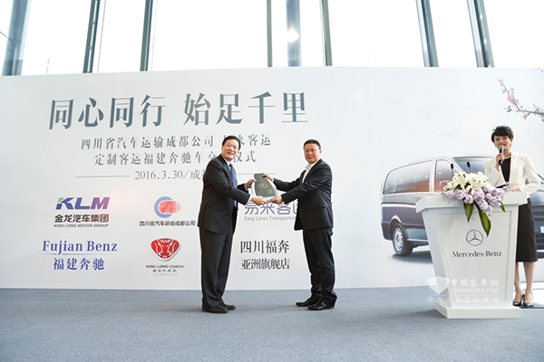 同心同行•始足千里---交车仪式现场2016年3月30日,四川成都,一场以“同心同行•始足千里”为主题的交车仪式隆重举行。在众位行业大佬的见证下,四川省汽车运输成都公司(以下简称成运集团)与厦门金龙礼宾车有限公司(以下简称金龙礼宾车)、四川福奔4S店等企业强强联手、合作融合,意在通过方便快捷的互联网方式,为成都高端商务人士带来定制化专车接送服务,开启成运集团“定制客运”的千里之行!