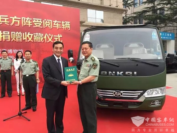 当天下午,在中国人民革命军事博物馆内,安凯客车董事长戴茂方将宝斯通受阅车正式交付给军事博物馆副馆长马琳杰大校,同时马琳杰大校将特制的收藏证书交给戴茂方董事长。从此,安凯宝斯通受阅车将在这里接受来自世界各地人民的参观瞻仰。