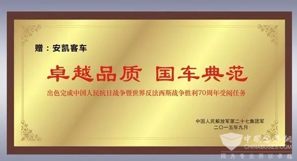 军方领导将刻有“卓越品质、国车典范”字样的牌匾赠与安凯客车