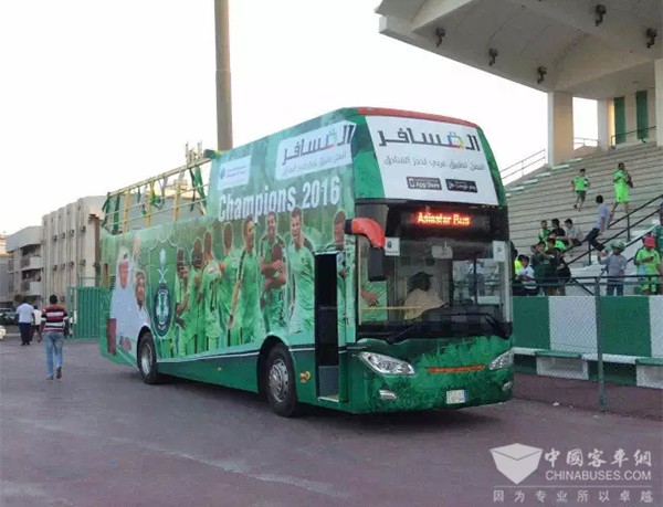 亚星客车豪华双层巴士以其稳定可靠的性能、舒适的乘坐环境、优雅大气的造型受到阿尔阿赫利球队的青睐,并被指定为其总决赛的专用球员接送车辆,向沙特球迷展示冠军强队的风采。