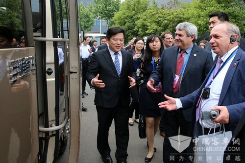 不仅如此,早在2015年4月13日,宇通T7正式亮相之前,中央政治局常委、全国人大常委会委员长张德江到宇通客车考察期间,就对宇通T7产生了极大的兴趣。张德江详细询问了车辆信息,并上车体验。在听取了宇通集团党委书记、总裁汤玉祥关于车辆振动噪声、功率、车辆设计等方面的汇报后,他高兴地说:“你们这个(宇通T7)窗户高,更安全一点,更好一点。”他还赞许宇通为中国客车争光。