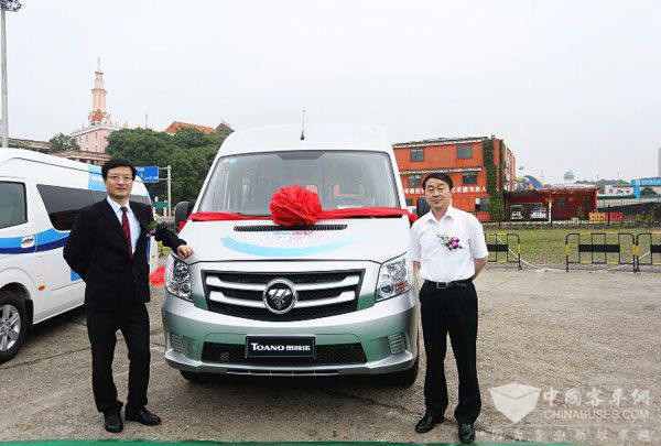 福田汽车集团轻型商用车事业本部副本部长、商务汽车业务总监、商务汽车销售公司经理潘林波先生与福田汽车北京福田发动机厂党委书记 谷俊民先生为图雅诺国V新品揭幕